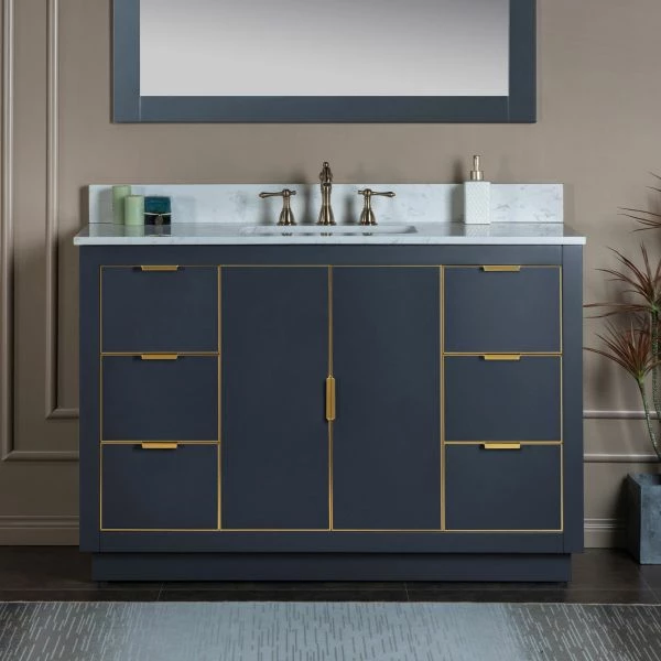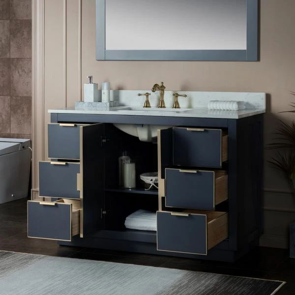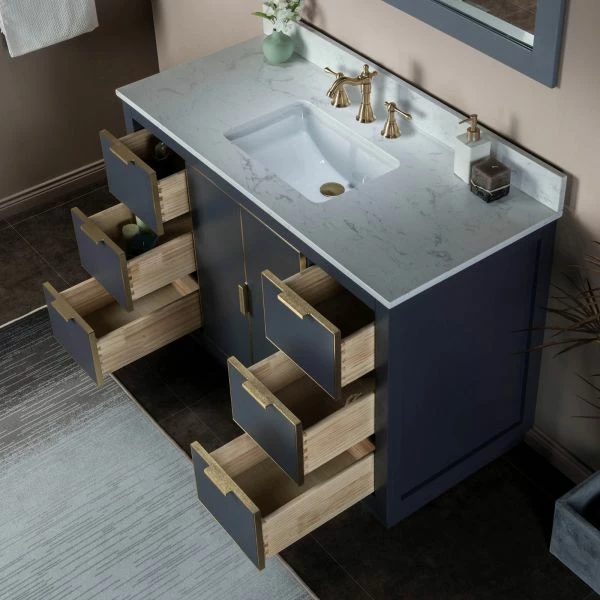 ✅ [DIMENSIONS]: Vanity dimensions: 48″ L x 21.5″ W x 33″ H; Engineered Stone Composite vanity top dimensions: 49″ L x 22″ W; Assembled dimensions with top and back splash: 49″ W x 22″ D x 38″ H