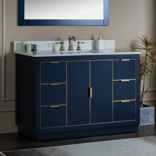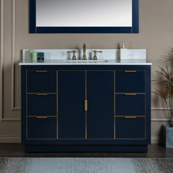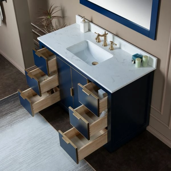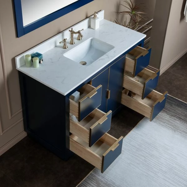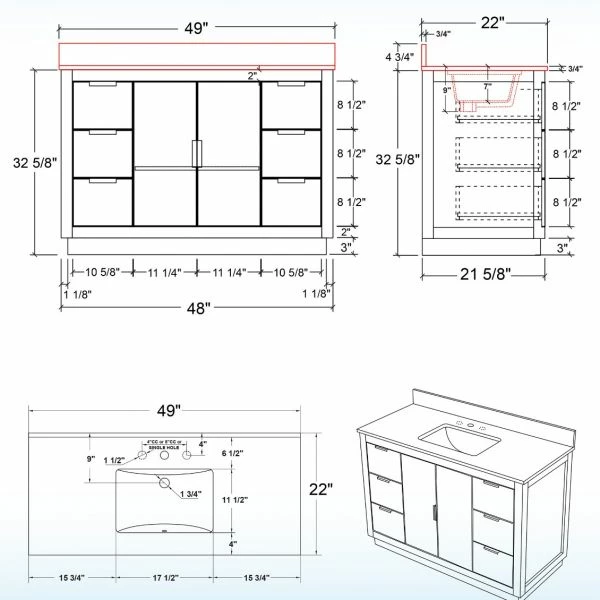 ✅ [DIMENSIONS]: Vanity dimensions: 48″ L x 21.5″ W x 33″ H; Engineered Stone Composite vanity top dimensions: 49″ L x 22″ W; Assembled dimensions with top and back splash: 49″ W x 22″ D x 38″ H