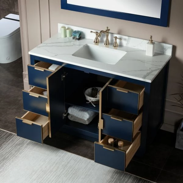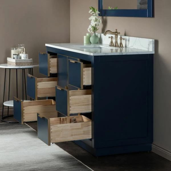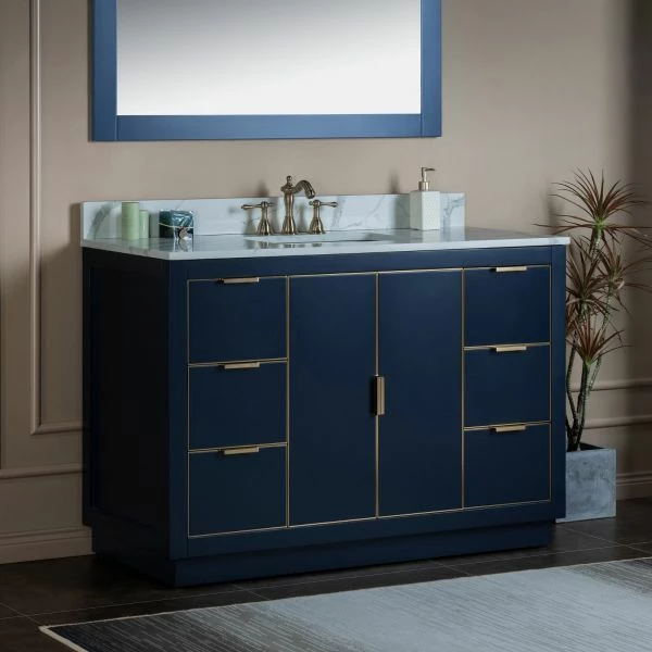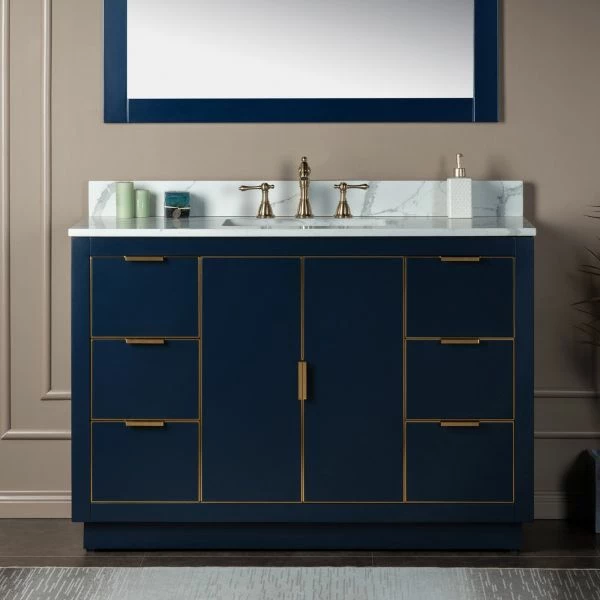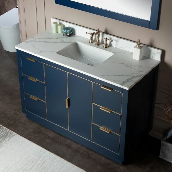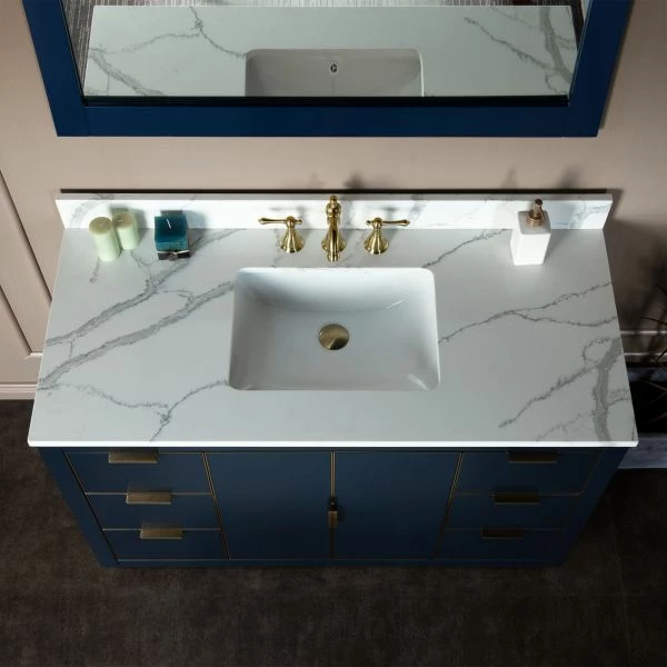 WOODBRIDGE Venice 48″x21″x33″ Solid Wood Bath Vanities Side Cabinet In Navy Blue With Gold Trim And Engineered Stone Composite Vanity Top In Fish Belly White With 3 Pre-Drilled Holes For 8-inch Widespread Faucet.