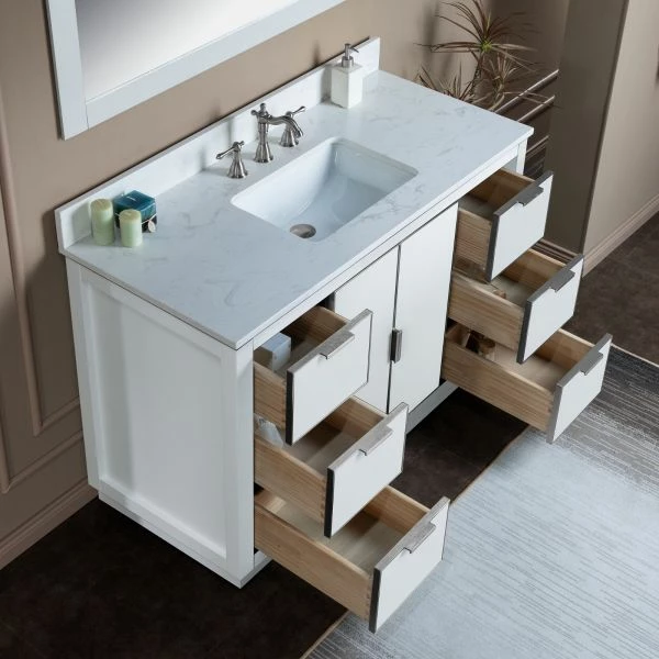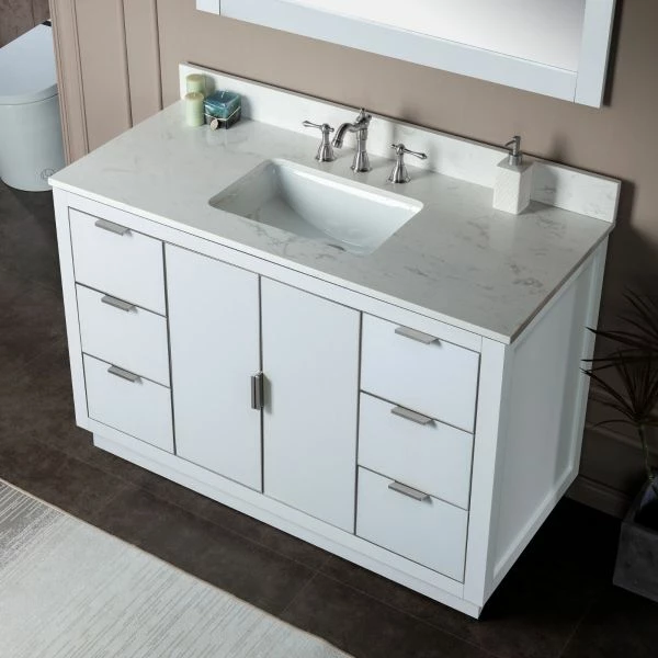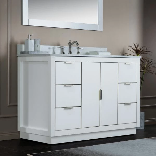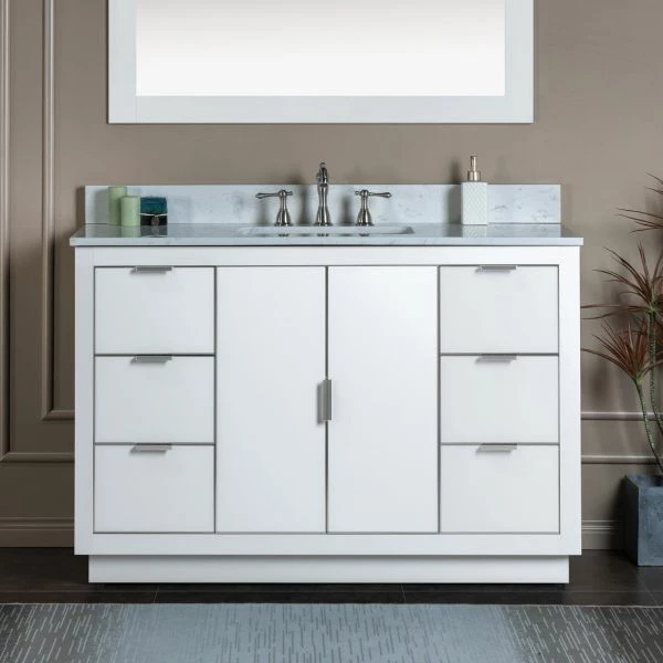 WOODBRIDGE Venice 48″x21″x33″ Solid Wood Bath Vanities Side Cabinet In White With Brushed Nickel Trim And Engineered Stone Composite Vanity Top In Carrara White 3 Pre-Drilled Holes For 8-inch Widespread Faucet.