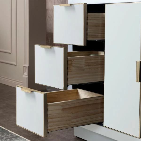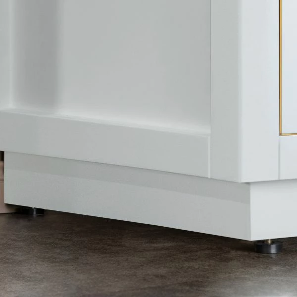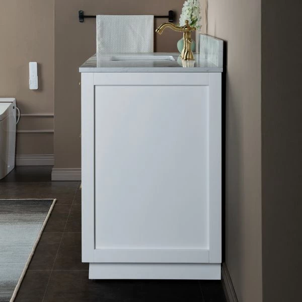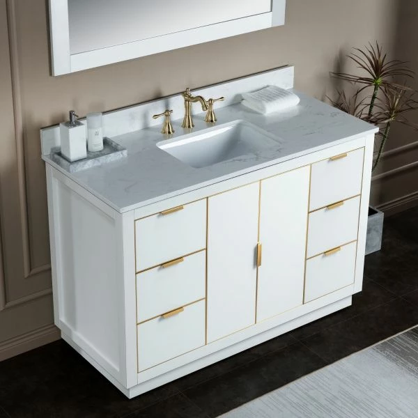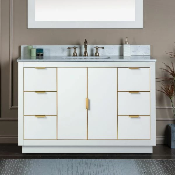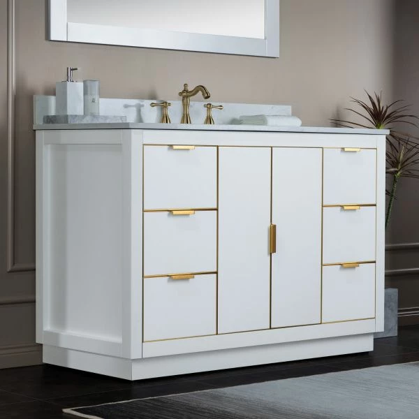 WOODBRIDGE Venice 48″x21″x33″ Solid Wood Bath Vanities Side Cabinet In White With Gold Trim And Engineered Stone Composite Vanity Top In Carrara White 3 Pre-Drilled Holes For 8-inch Widespread Faucet.