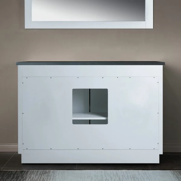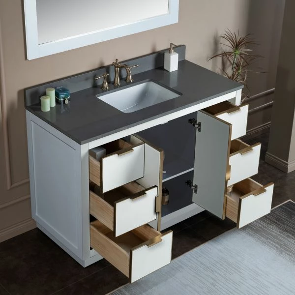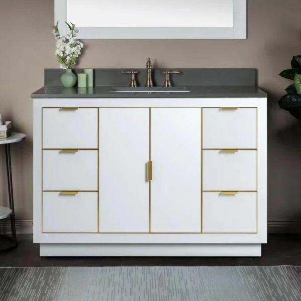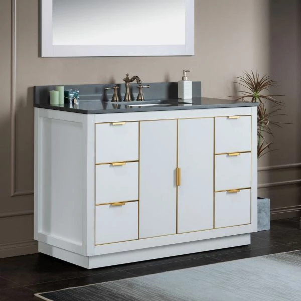 WOODBRIDGE Venice 48″x21″x33″ Solid Wood Bath Vanities Side Cabinet In White With Gold Trim And Engineered Stone Composite Vanity Top In Dark Gray With 3 Pre-Drilled Holes For 8-inch Widespread Faucet.