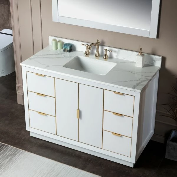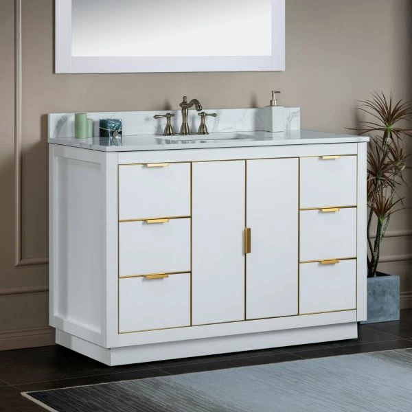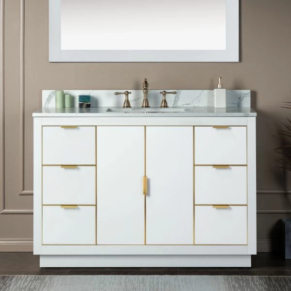 ✅ [DIMENSIONS]: Vanity dimensions: 48″ L x 21.5″ W x 33″ H; Engineered Stone Composite vanity top dimensions: 49″ L x 22″ W; Assembled dimensions with top and back splash: 49″ W x 22″ D x 38″ H