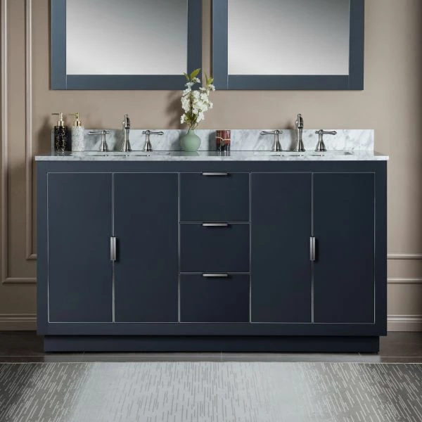 β [DIMENSIONS]: Vanity dimensions: 60″ L x 21.5″ W x 33″ H; Carrara white marble vanity top dimensions: 61″ L x 22″ W; Assembled dimensions with top and back splash: 61″ W x 22″ D x 38″ H