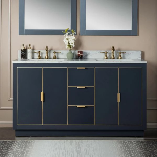 WOODBRIDGE Venice 60″x21″x33″ Solid Wood Bath Vanities Side Cabinet In Grey With Gold Trim And Engineered Stone Composite Vanity Top In Fish Belly White With 3 Pre-Drilled Holes For 8-inch Widespread Faucet.