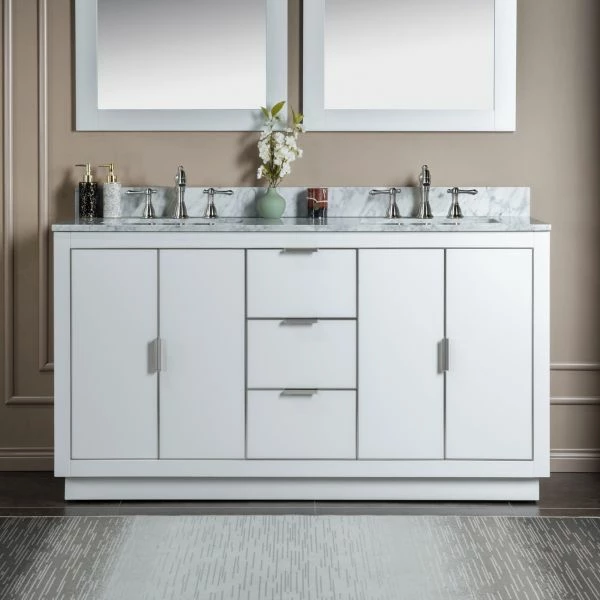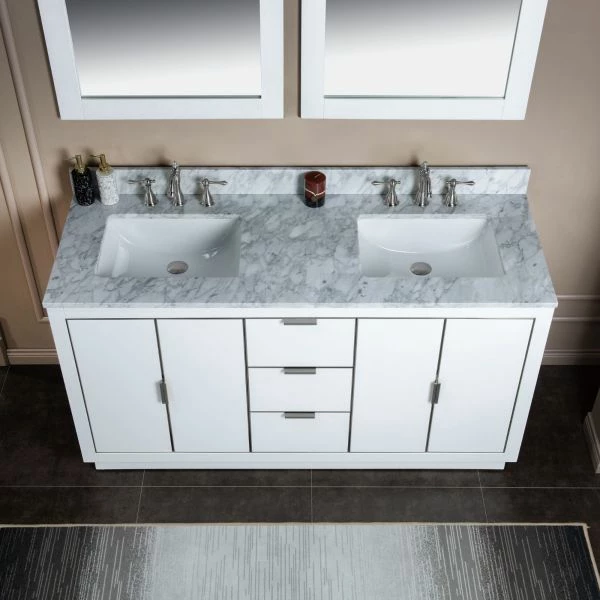 โ [DIMENSIONS]: Vanity dimensions: 60″ L x 21.5″ W x 33″ H; Carrara white marble vanity top dimensions: 61″ L x 22″ W; Assembled dimensions with top and back splash: 61″ W x 22″ D x 38″ H