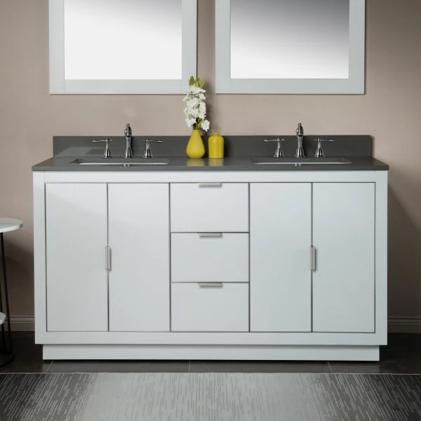 WOODBRIDGE Venice 60″x21″x33″ Solid Wood Bath Vanities Side Cabinet In White With Brushed Nickel Trim And Engineered Stone Composite Vanity Top In Dark Gray With 3 Pre-Drilled Holes For 8-inch Widespread Faucet.