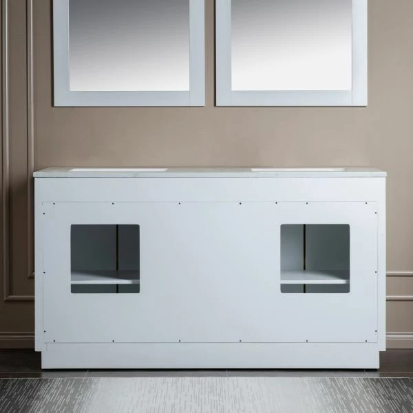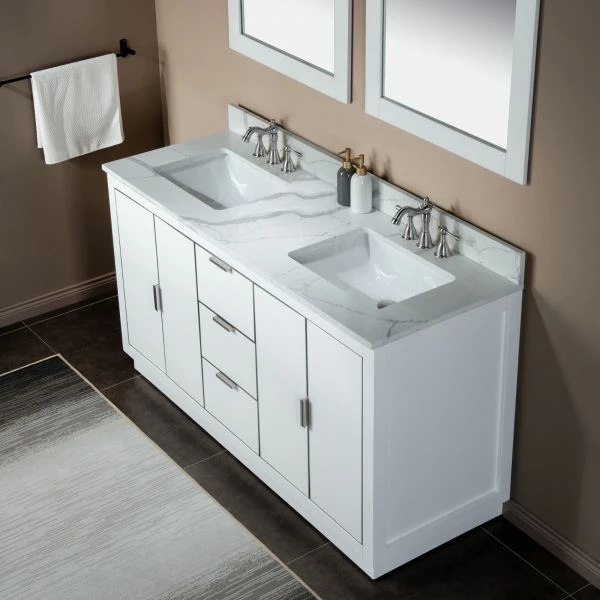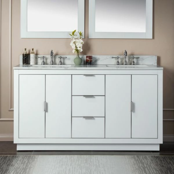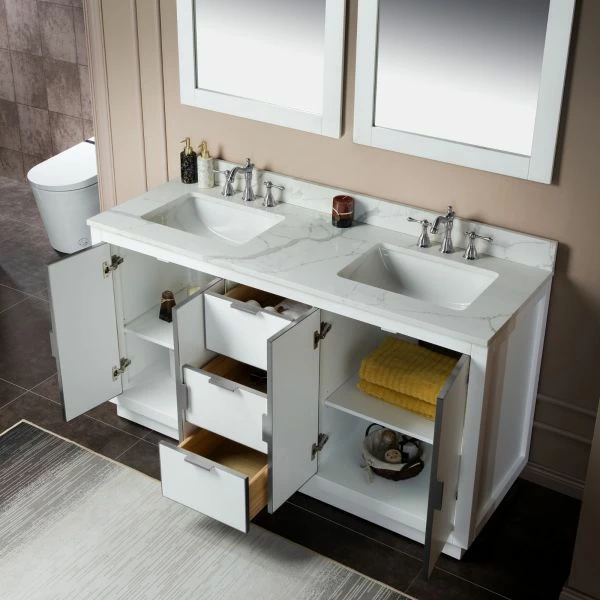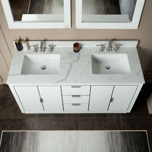 ✅ [DIMENSIONS]: Vanity dimensions: 60″ L x 21.5″ W x 33″ H; Engineered Stone Composite vanity top dimensions: 61″ L x 22″ W; Assembled dimensions with top and back splash: 61″ W x 22″ D x 38″ H
