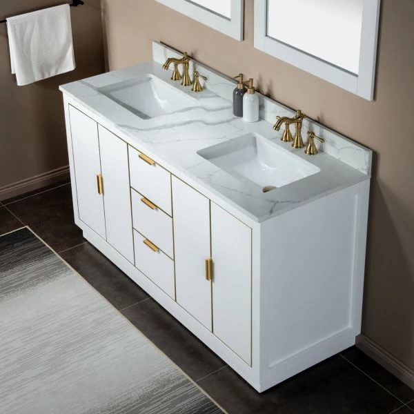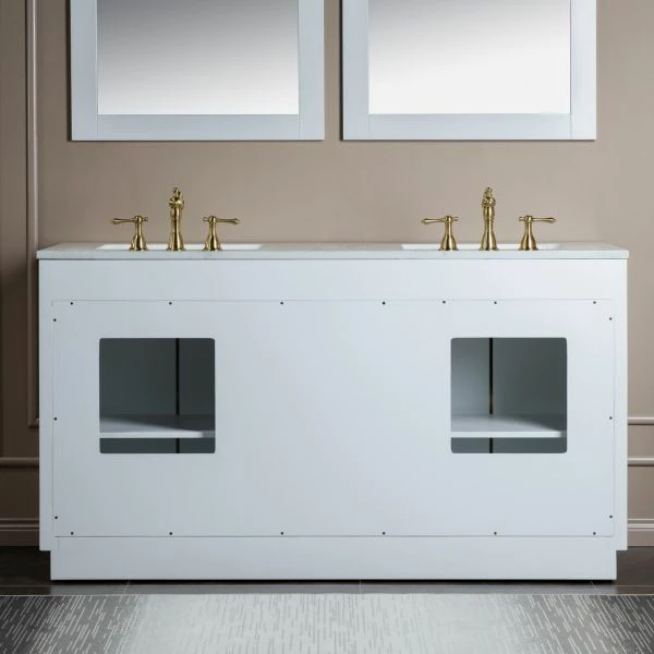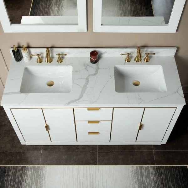 WOODBRIDGE Venice 60″x21″x33″ Solid Wood Bath Vanities Side Cabinet In White With Gold Trim And Engineered Stone Composite Vanity Top In Fish Belly White With 3 Pre-Drilled Holes For 8-inch Widespread Faucet.
