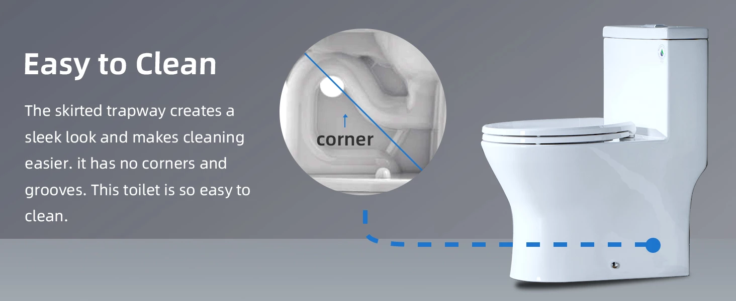 ✔ [EASY TO CLEAN DESIGN]: The skirted trap way creates a sleek look and makes cleaning easier. Compare to other toilets, it has no corners and grooves, very easy to reach for cleaning .
